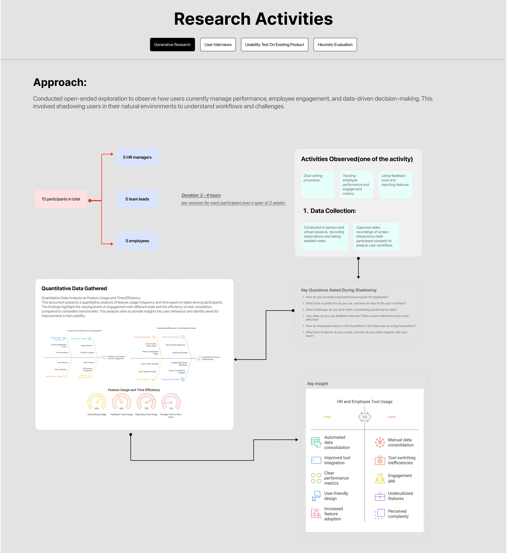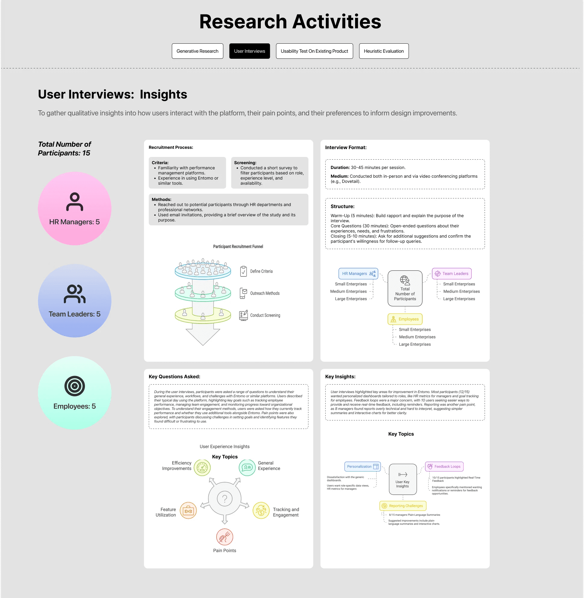 To enhance Entomo's performance management platform, I conducted comprehensive user research focusing on understanding user behaviors, needs, and pain points. The research methodology included: