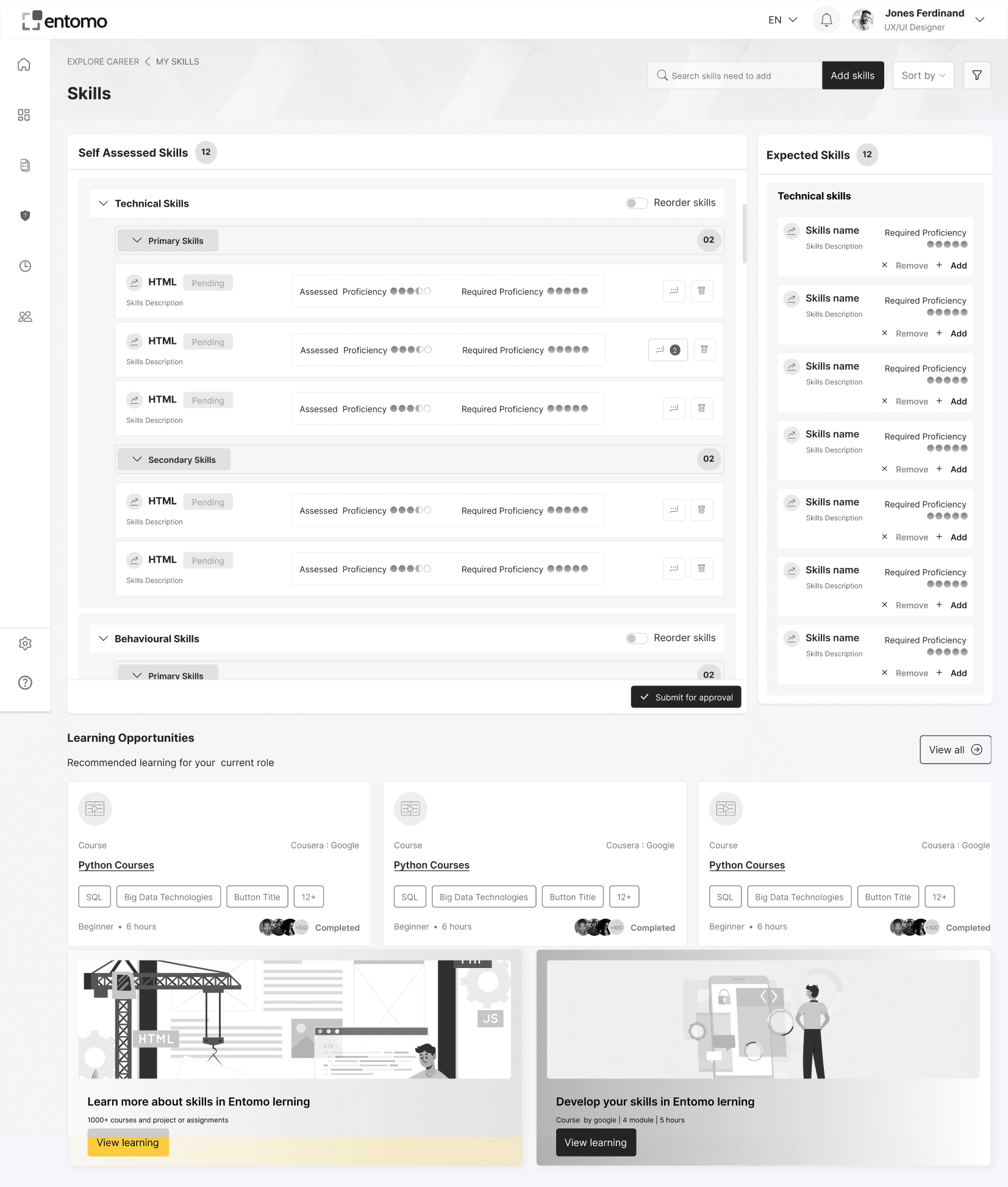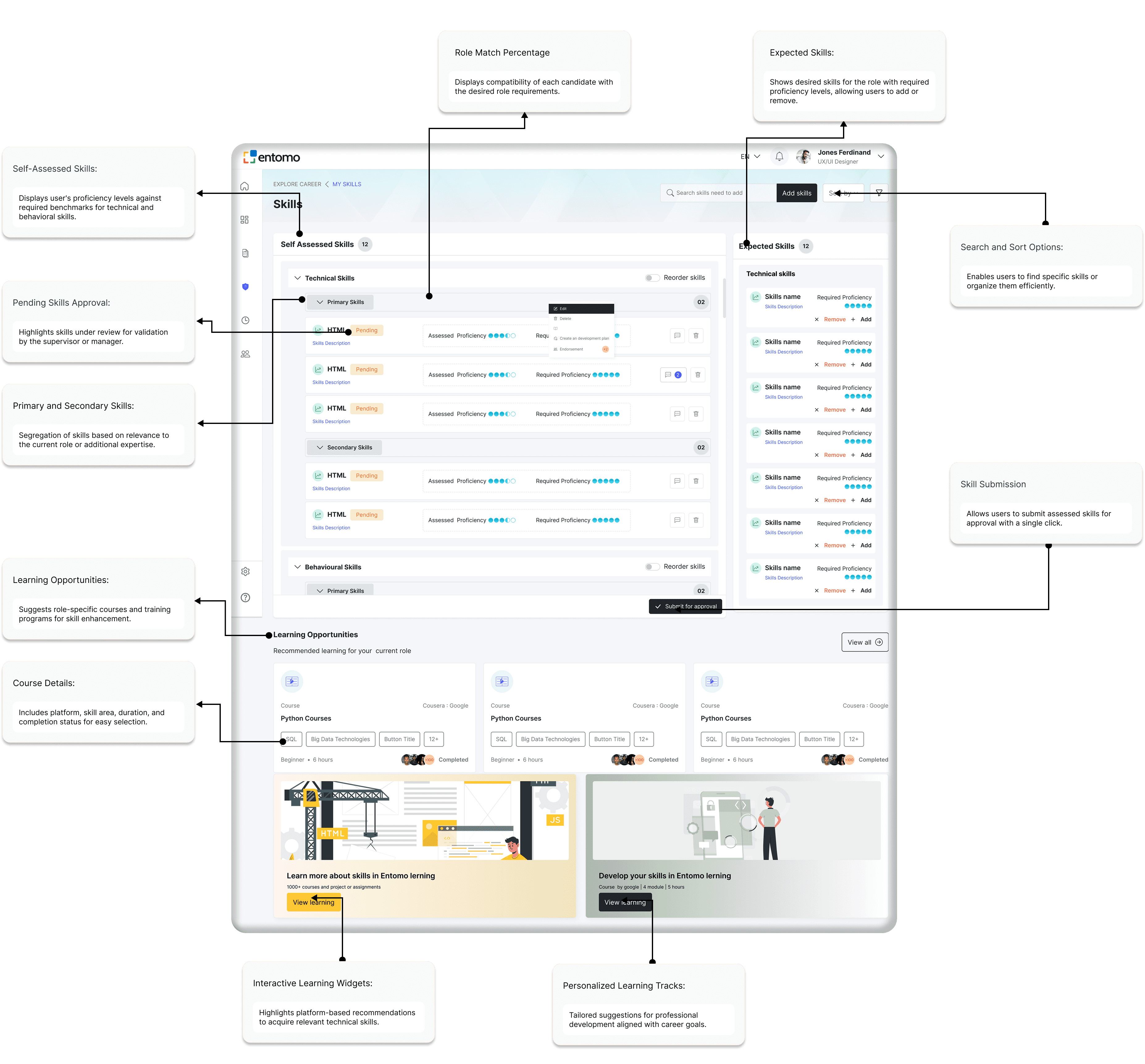 The Skills Dashboard provides an overview of an individual's technical, behavioral, and self-assessed skills, along with expected skill requirements for their role. Users can view proficiency levels, identify skill gaps, and take actions like editing, endorsing, or adding skills to learning plans. The dashboard also highlights recommended learning opportunities and courses to help users enhance their capabilities and align with role expectations. This screen promotes continuous learning and skill development to drive professional growth.