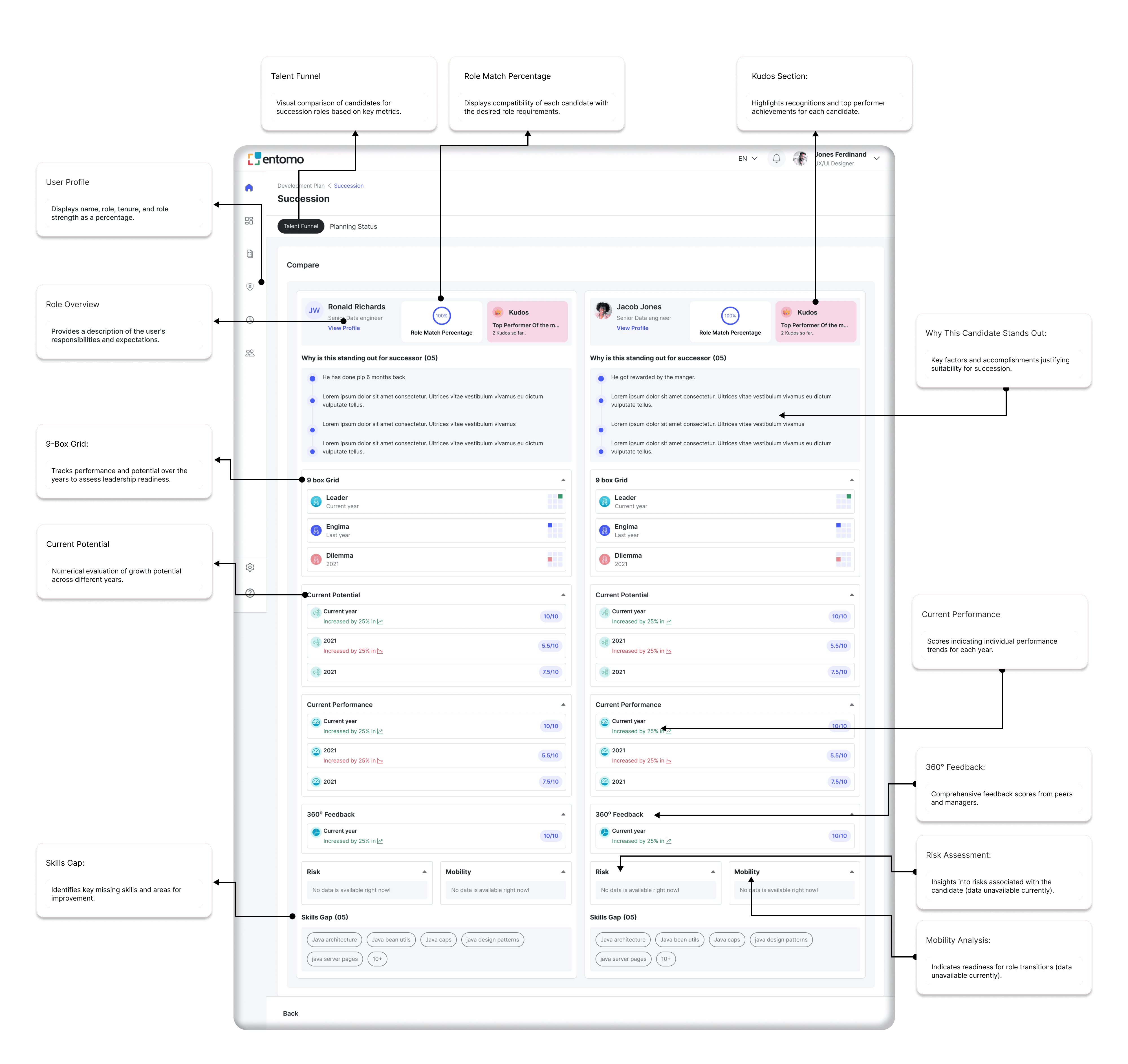 The Succession Planning screen is designed to compare potential successors for critical roles within the organization. It provides a detailed analysis of candidates' role match percentage, current potential, and performance over time. Key metrics like 9-box grid placement, 360° feedback, and skill gaps are displayed to evaluate readiness and suitability. This screen helps leaders identify top performers, assess risks, and plan for seamless transitions, ensuring organizational stability and future growth.