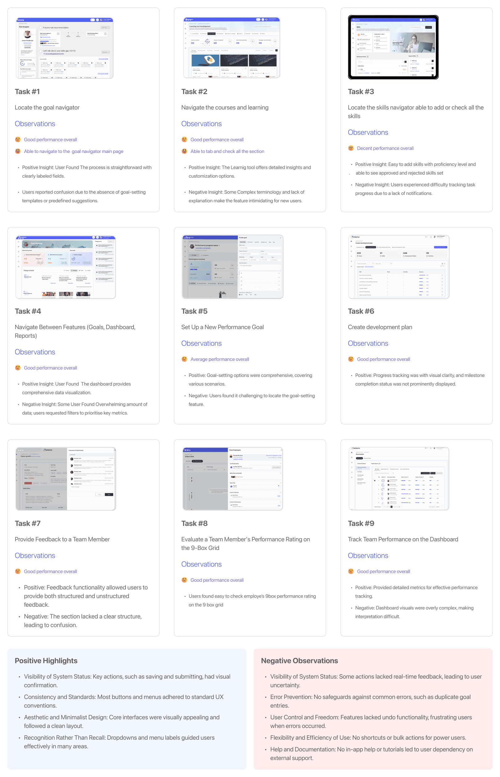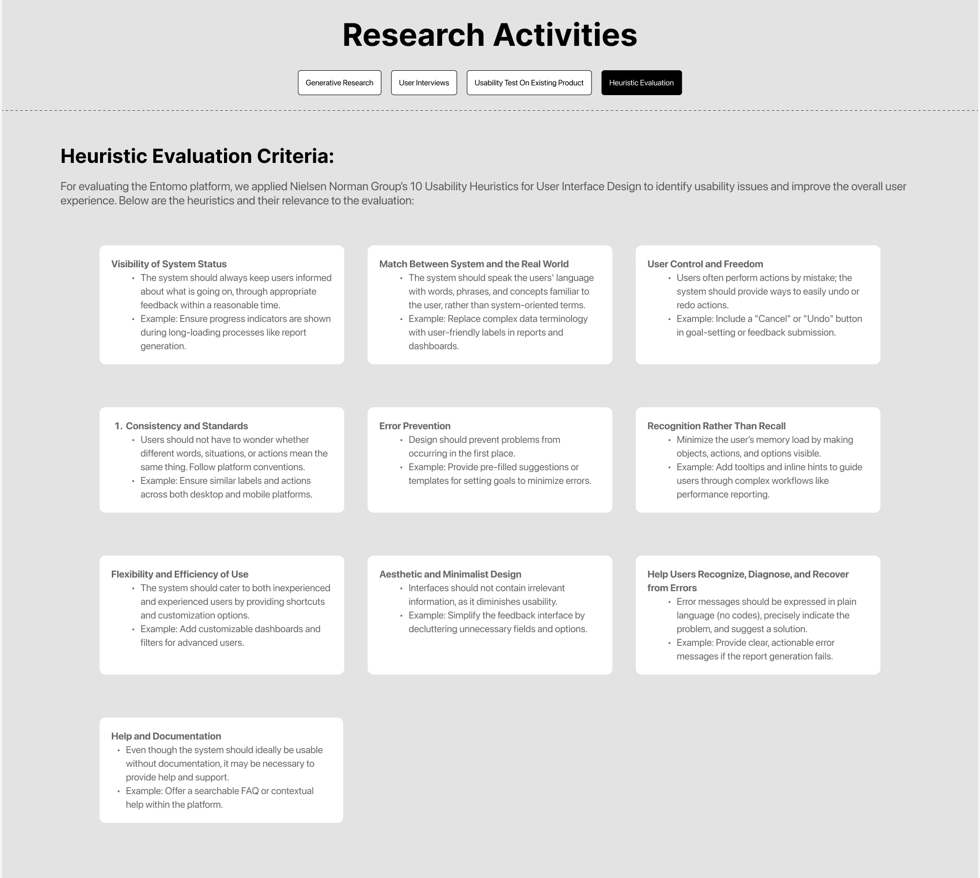 A team of five members conducted a thorough evaluation of Entomo's performance management platform to identify areas for improvement in user experience and functionality. Using Nielsen Norman Group’s 10 Usability Heuristics for User Interface Design as a framework, we reviewed static screens of key features, including goal setting, performance tracking, and feedback modules. Both the desktop and mobile interfaces were analyzed.