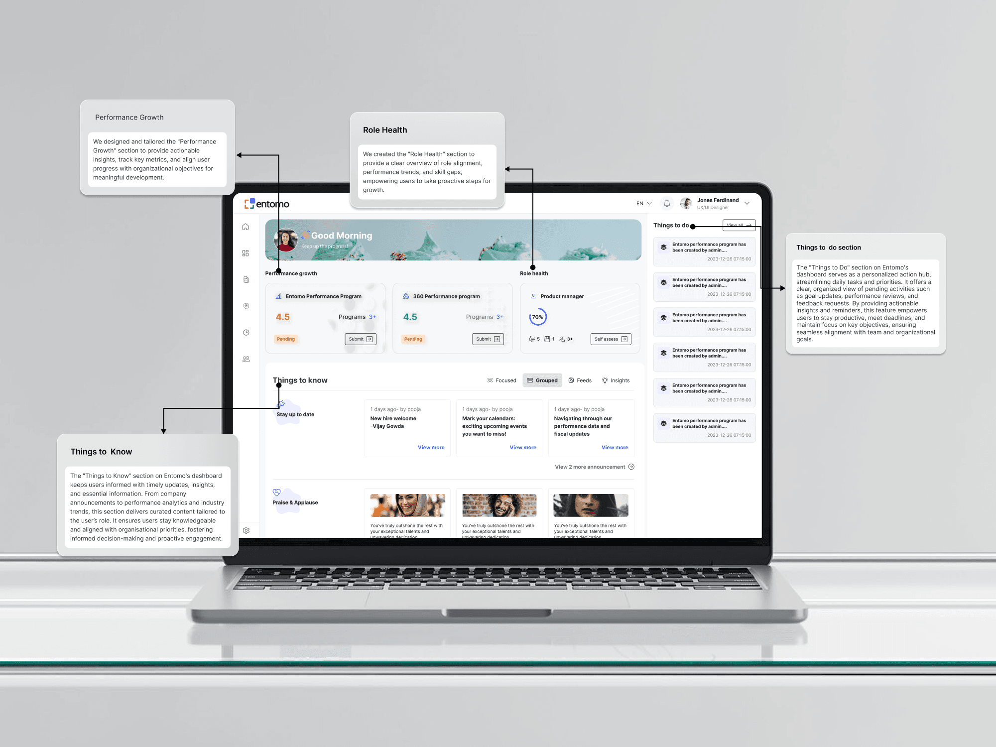 Modern organizations face significant challenges in aligning employee performance with strategic objectives due to fragmented feedback mechanisms, lack of actionable insights, and ineffective engagement tools. Employees often struggle with unclear goals, limited growth opportunities, and disconnected development journeys, leading to reduced productivity and satisfaction. As a UX design challenge, Entomo must provide a seamless, user-centric platform that empowers organizations and employees with intuitive goal tracking, actionable insights, and personalized development experiences while ensuring accessibility, simplicity, and engagement.