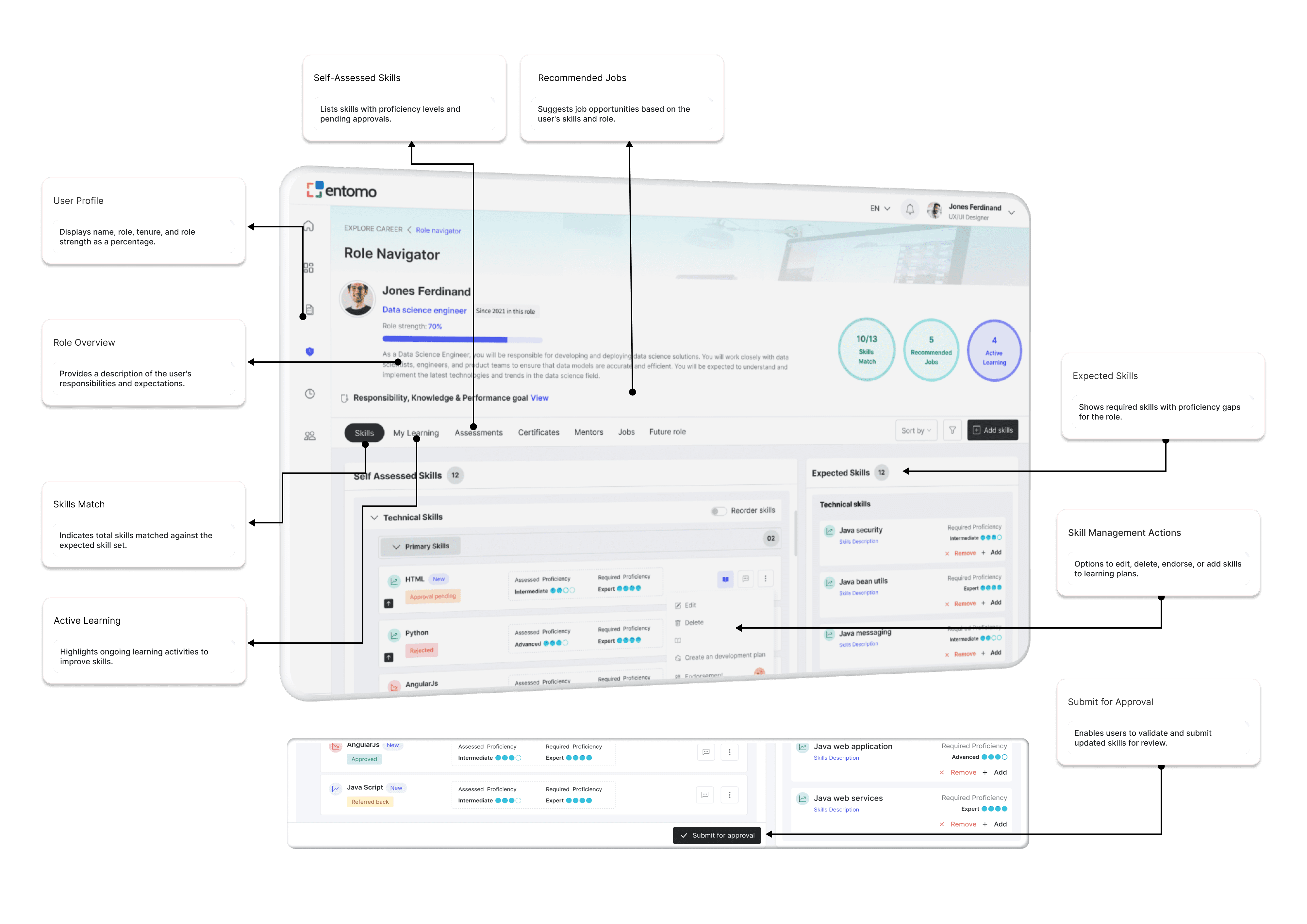 The Role Navigator screen is designed to provide users with a comprehensive overview of their current role, skills, and development opportunities. It highlights key metrics such as role strength, matched skills, and recommended jobs, while offering actionable insights into skill gaps and ongoing learning activities. Users can self-assess their skills, view expected proficiencies, and manage their development through options like editing, endorsing, or adding skills to learning plans. This screen empowers individuals to align with organizational expectations and take proactive steps toward career growth and skill enhancement.